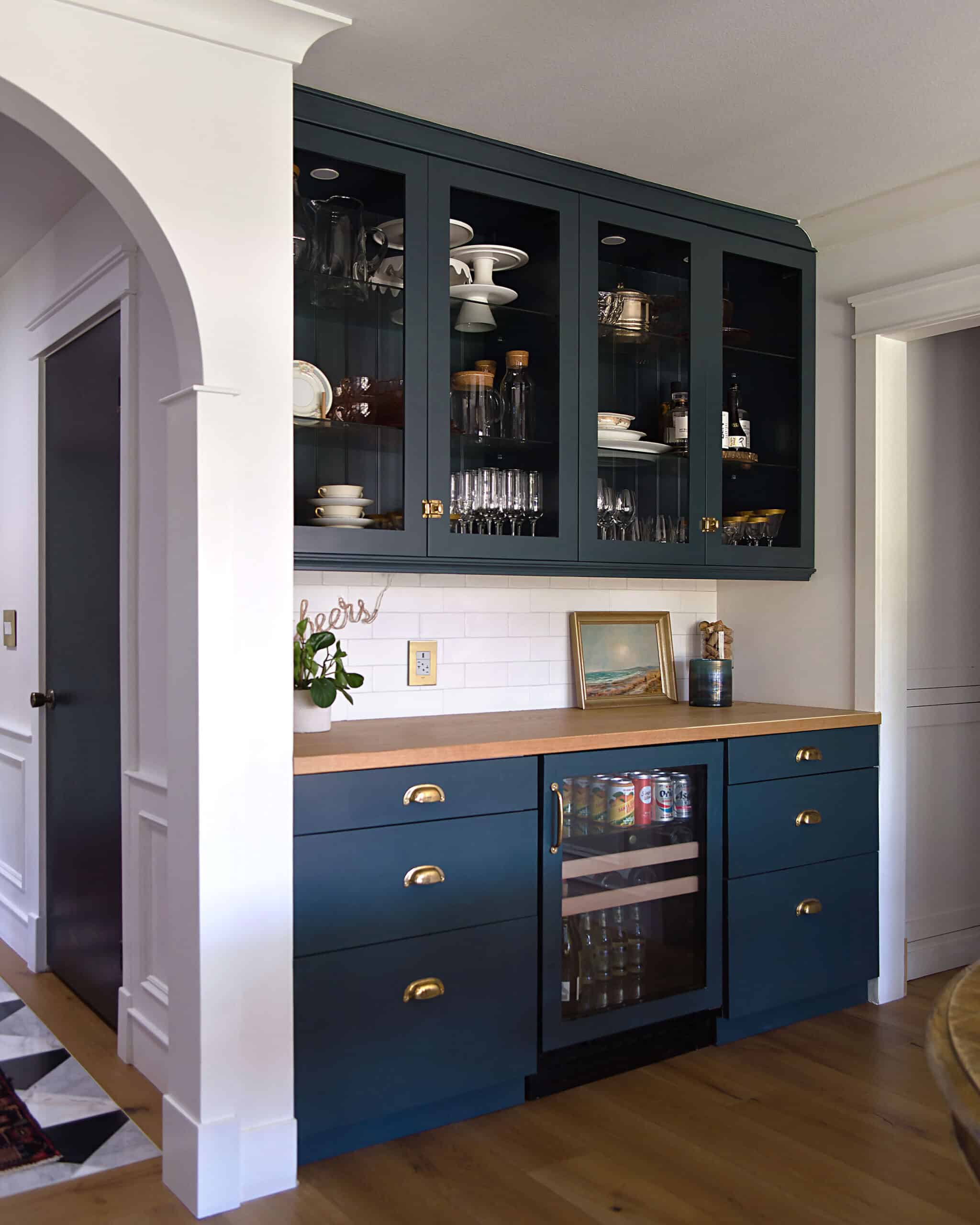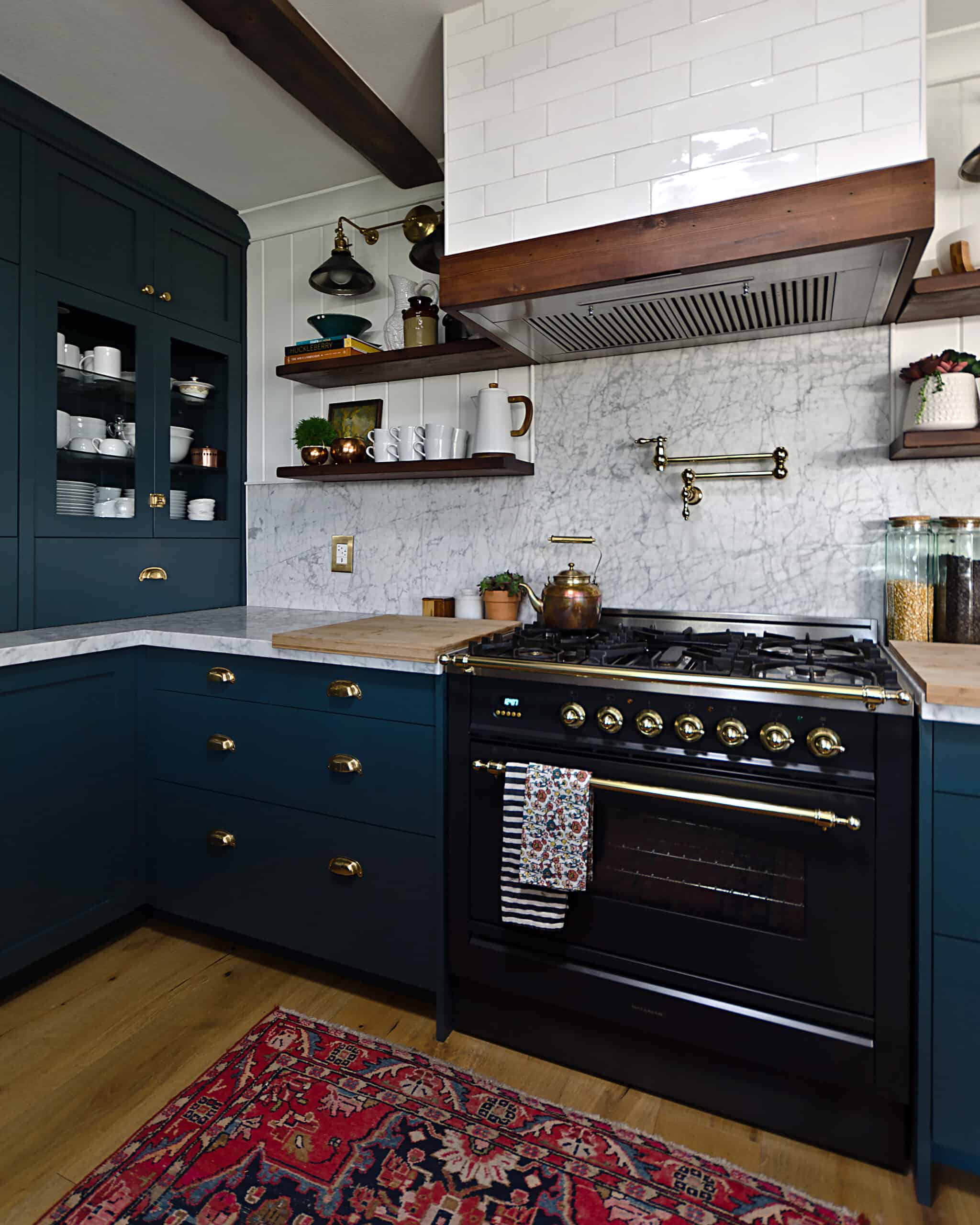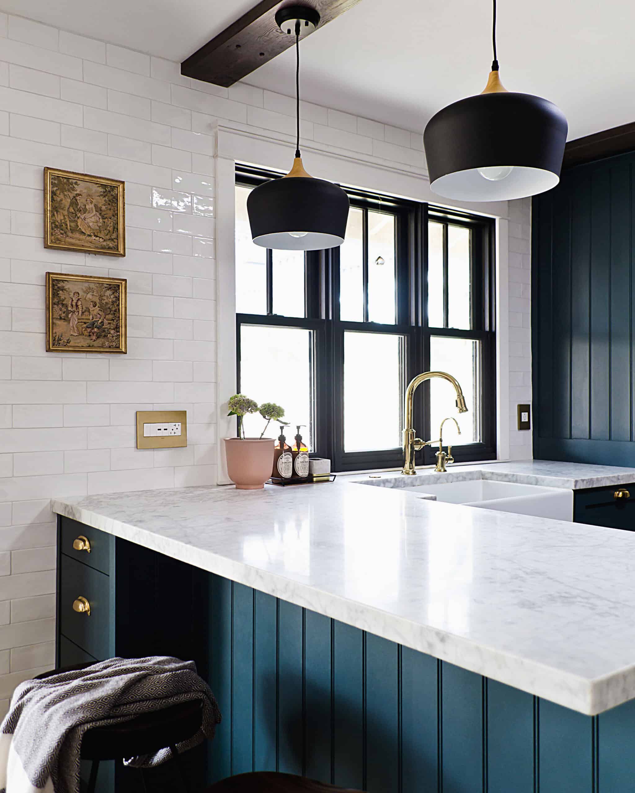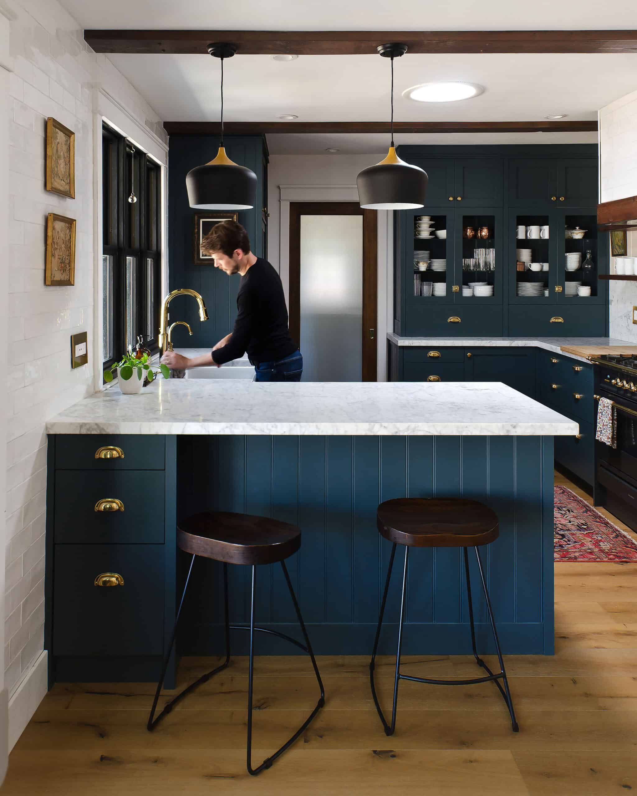 I always knew I wanted dark, so it was a question of whether we would go black or navy! Originally, I had planned for two-toned, white uppers and dark lowers as I did in the kitchen update. Very similar to Emily’s kitchen in the Glendale house! I do particularly like dark lowers and light uppers, especially when the uppers are painted the same color as the ceiling, as the dark lowers are grounding and the light uppers are lifting, creating the illusion of a taller space.