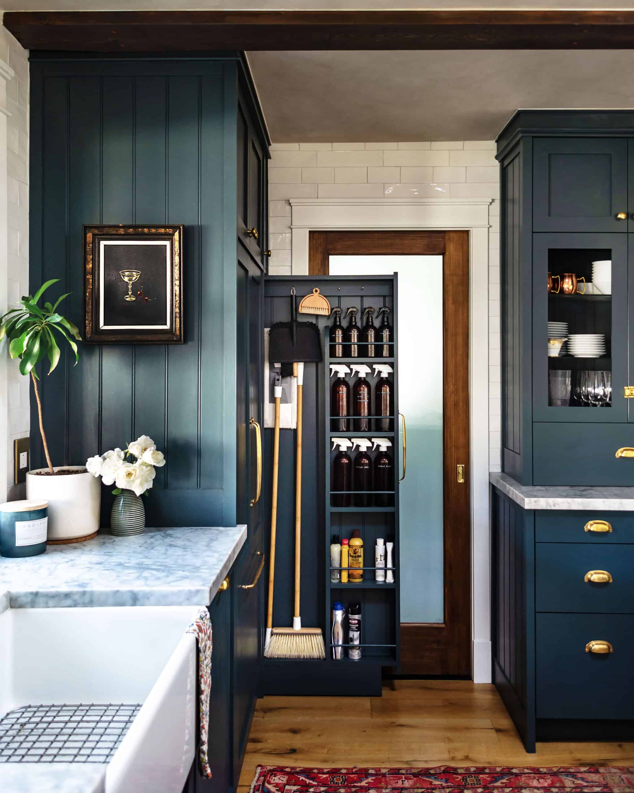 The hardest thing to figure out and build was our broom cupboard by far. Everything else came together with little to no issue, but it took a month to figure out how to get our broom cupboard to slide out and stay up! We ended up with both drawer sliders AND rollers disguised behind the “toe-kick”.