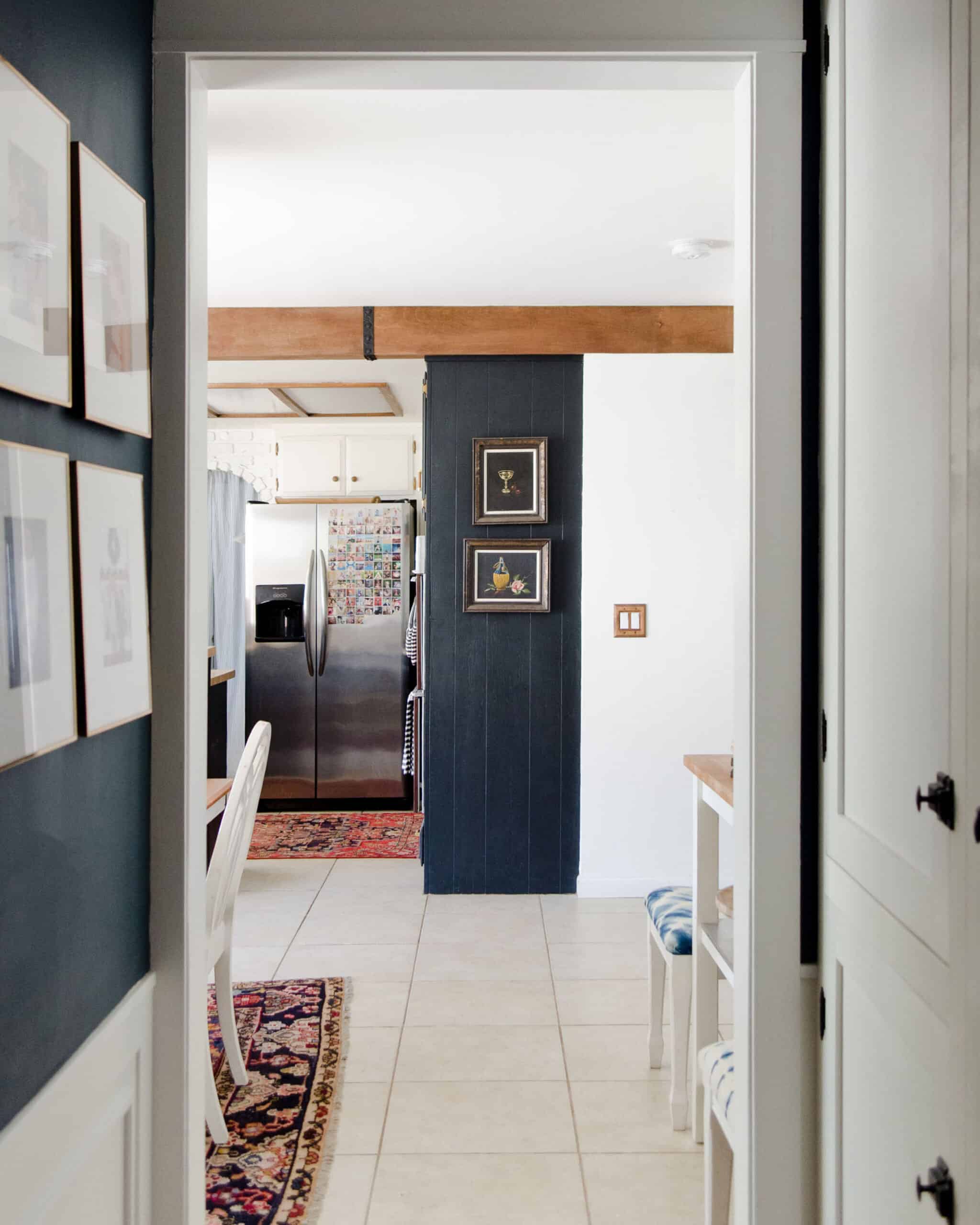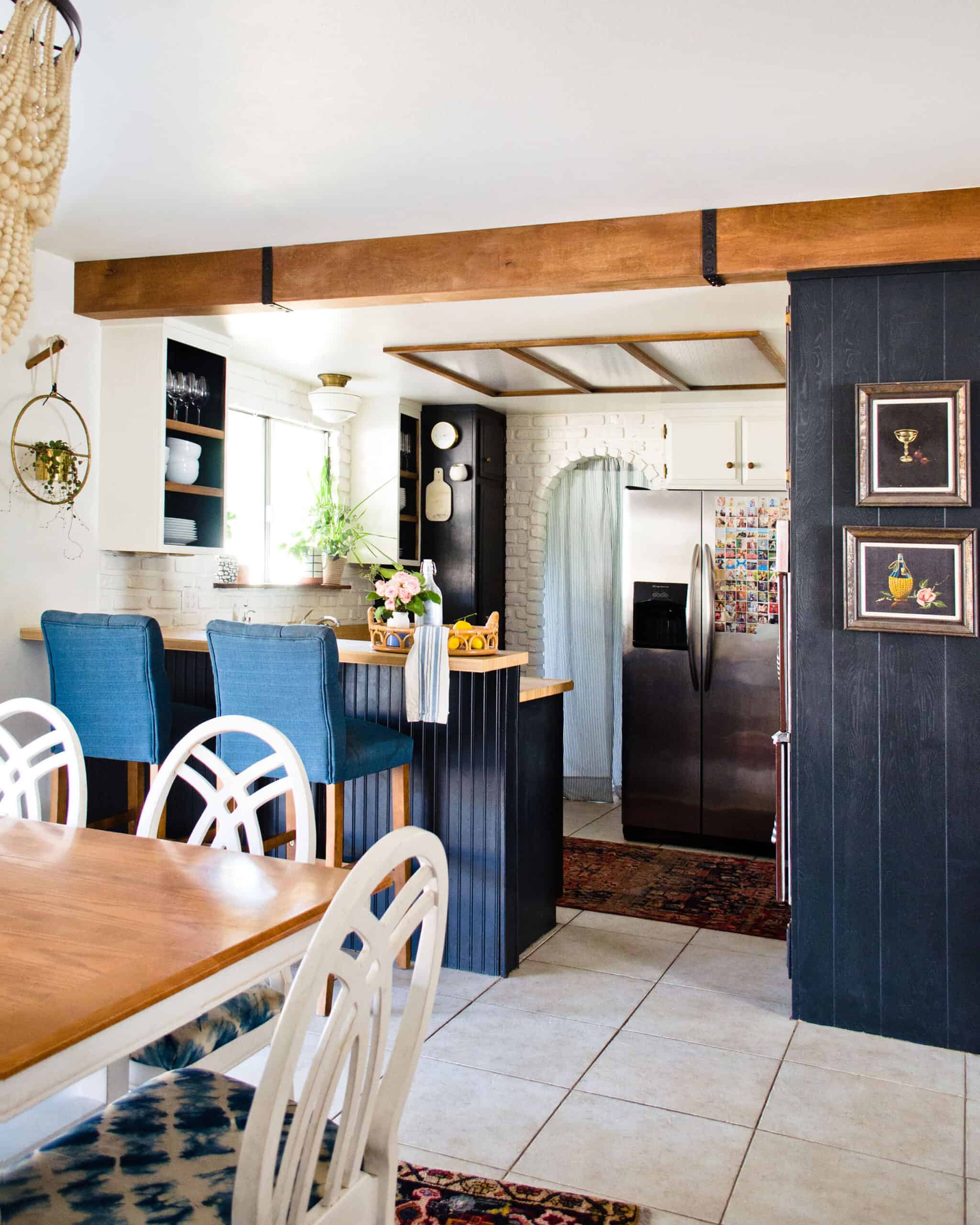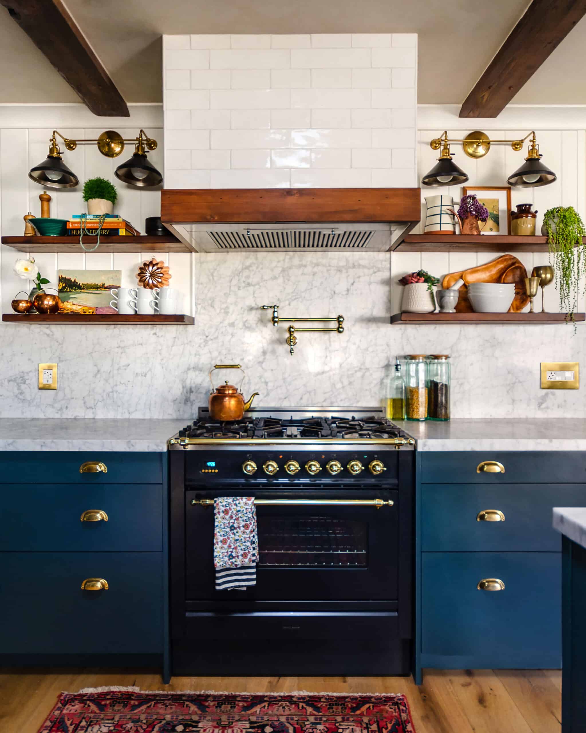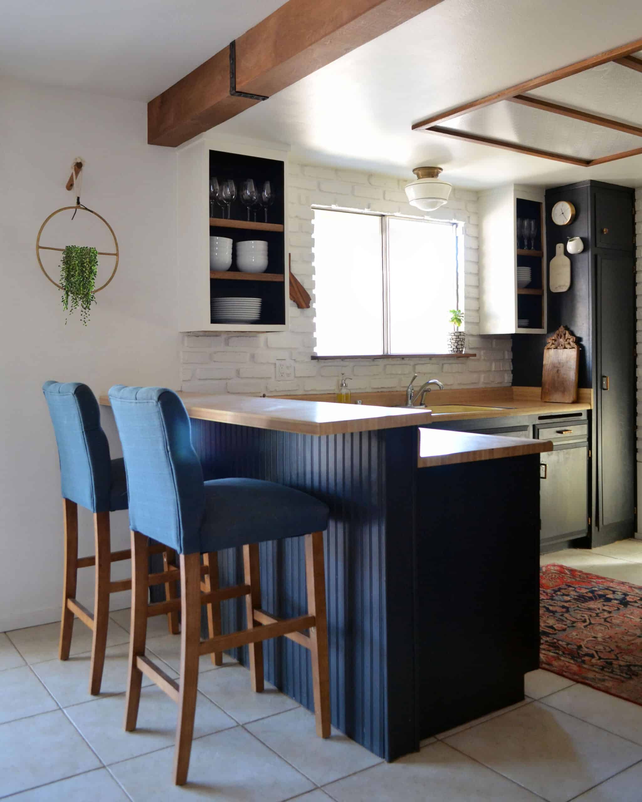 It took four weeks from the demo of the old kitchen to finished and primed drywall, ready for cabinet hanging. After that, it took about a month and a half to get our kitchen sink back, which was 11 weeks total. We had all the end panels and toe-kicks in after about 3 months. The smaller or more finishing details–the tile, beams, cabinet crown, wall paneling, and open shelving all trickled in over the next year.