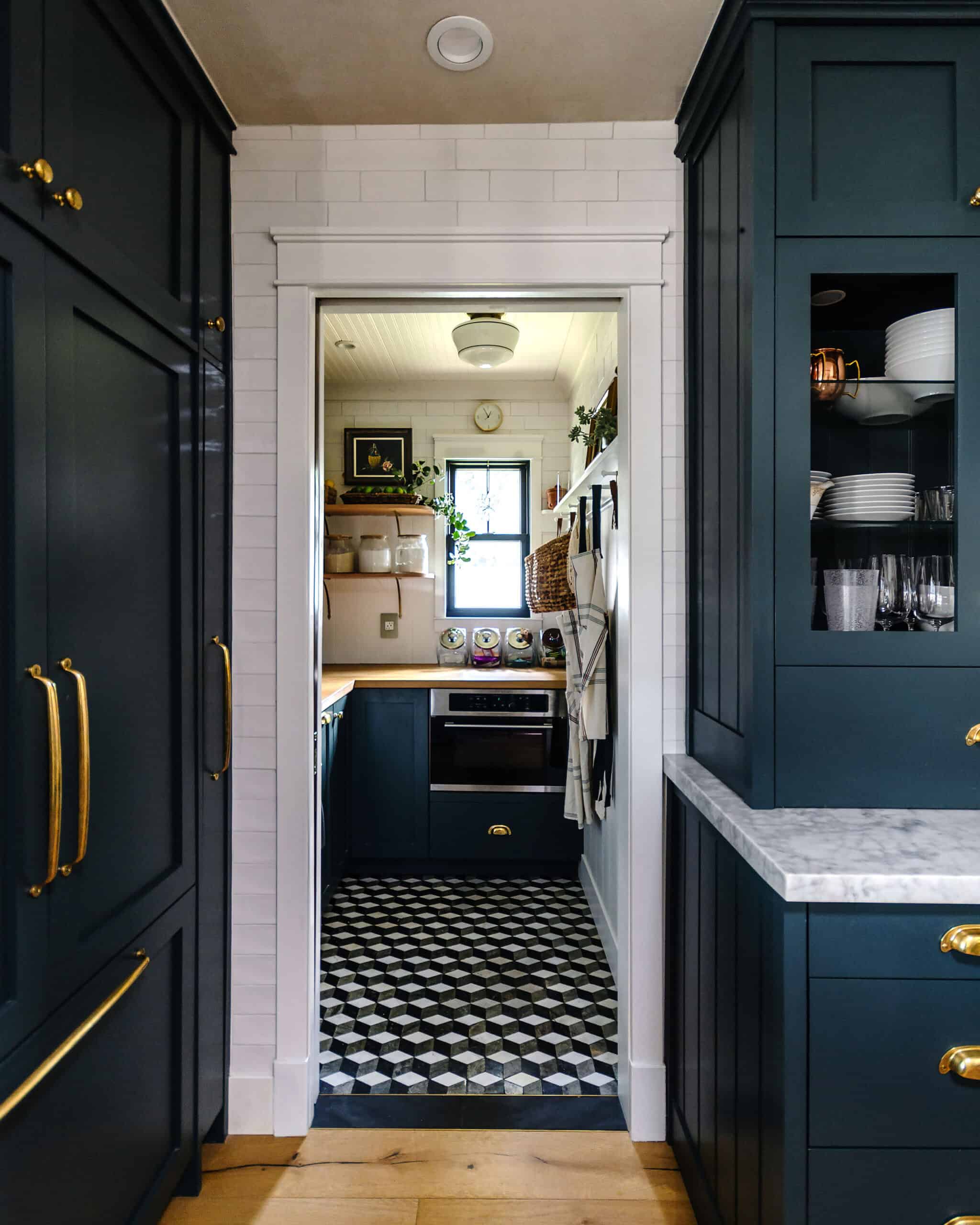 I have been pulling specific ideas for what I want in MY kitchen since I joined Pinterest in Feb 2011. I officially decided on Carrara marble counters in 2012. Other inspirations come from ideas I gathered as a child; I’d see something and say “I want that in my house when I grow up”. This is where the brass Schluter comes into my flooring. I remember seeing brass inlay in Tomorrowland (at Disneyland) and municipal buildings growing up in LA, especially being worked in with terrazzo, and knowing I loved that detail and I wanted it in my house. The tumbling blocks in my pantry is because of a visit to the Getty Villa on a 6th-grade field trip.