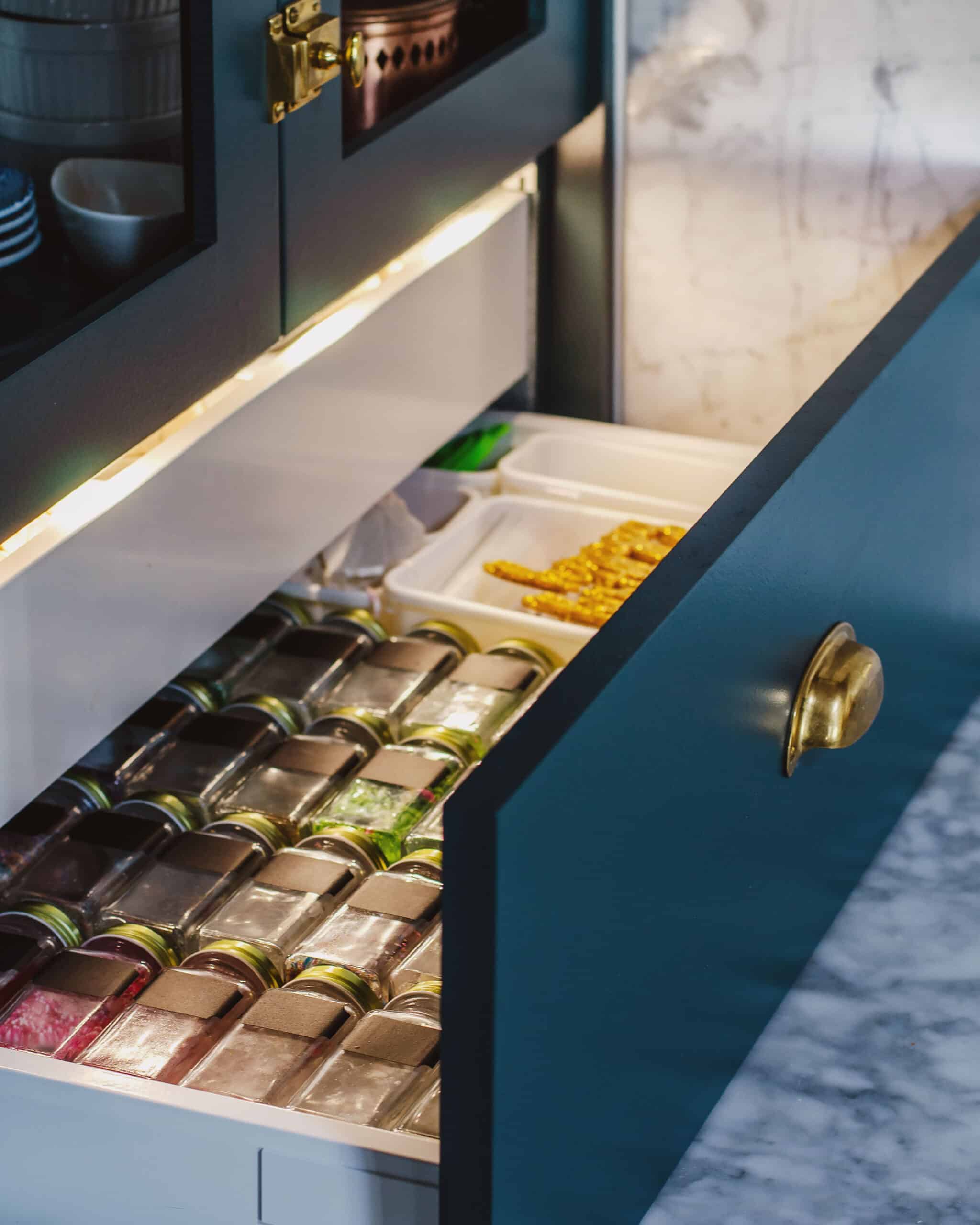 To understand what you have to work with as far as cabinetry symmetry goes, you need to establish where the main appliances of the kitchen are going; fridge, stove, sink, and, usually, dishwasher. I particularly like to go with a custom paneled dishwasher especially, because it gives you more options to play with when it comes to cabinetry, and also I personally am not a fan of a giant slab of stainless steel in the middle of my beautiful cabinetry. Some people love the industrial look of that and that’s just fine, but I think its good to remember that the option to integrate the dishwasher into your cabinetry to help balance the room is an option. I also think that a trash & recycling drawer is something not to be overlooked. Indeed, it is my favorite feature of my kitchen! It’s great not having to put our trash or recycling in whatever standing space we can find. I also love our spice drawer… which leads us to how to decide what goes in what drawers.