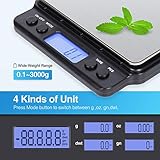 Highprecision wide range this kitchen scale is equipped with high precision sensor system 01g minimum measurable weight is much more precise than 03g of other general scales provide you accurate measurements from 01g up to 3000g reads weights in increments of 01g Stylish design space saver minimalistic and elegant design the food scales mini and compact size product dimensions 417 x 5 x 34 Platform dimensions 4×4 takes up minimal space on your desk makes it a pro pocket scale and makes it easy for carrying and storage