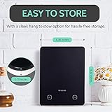 Practical design our kitchen scale is designed with tempered glass for strong bearingsleek stainless steel surface for waterproof antifingerprint and easy cleanWith hidden hook on the leftyou can hang it up to save space