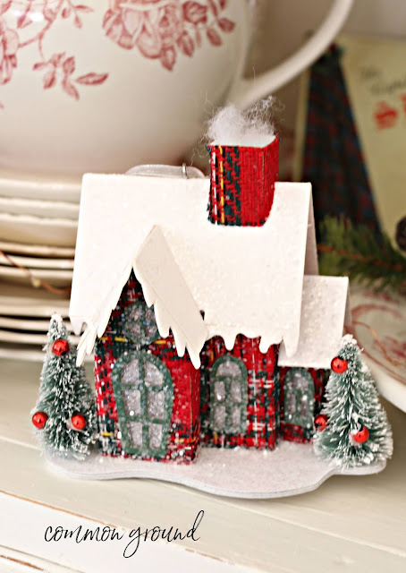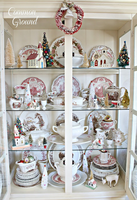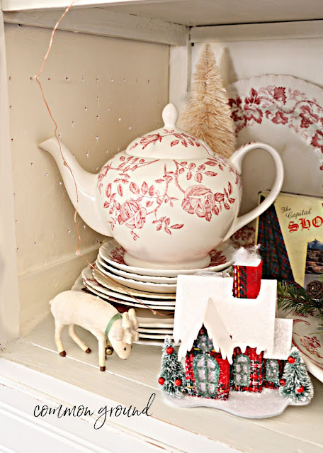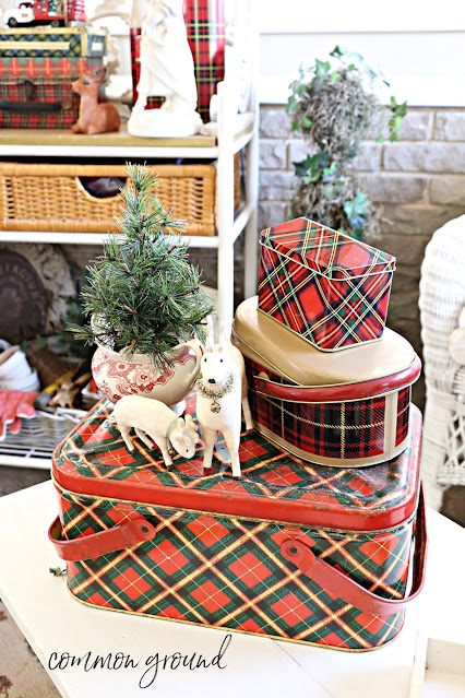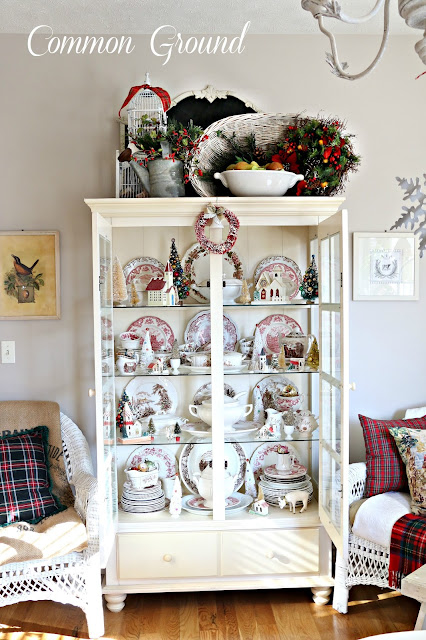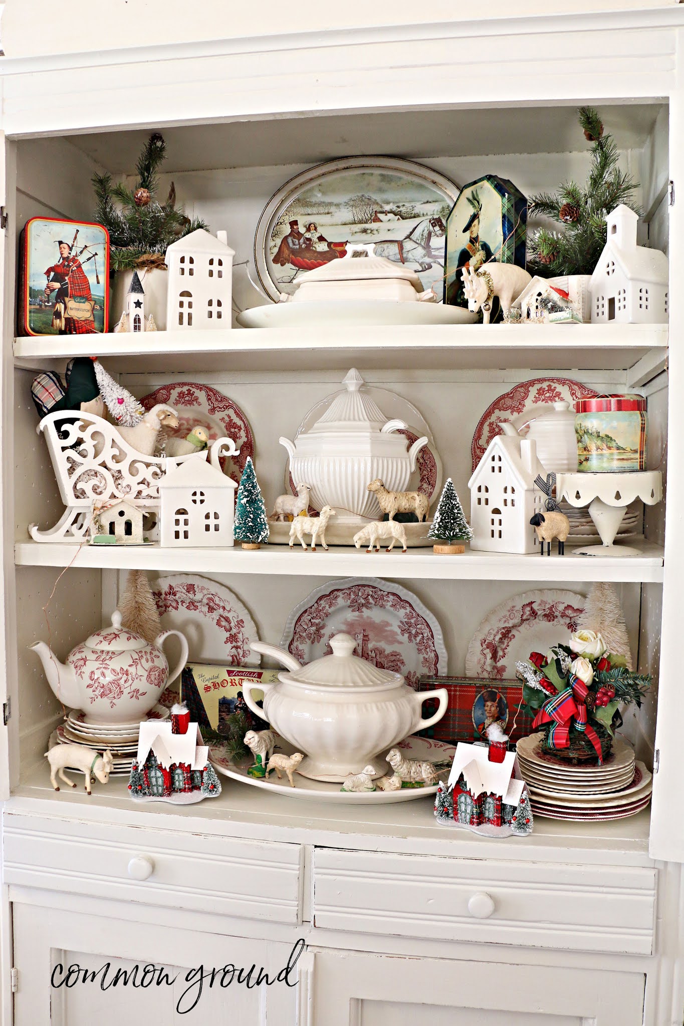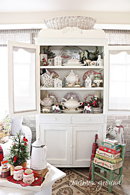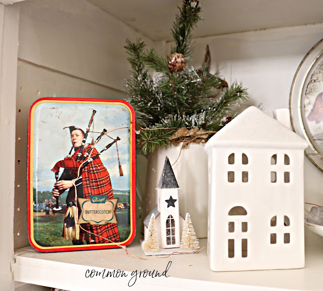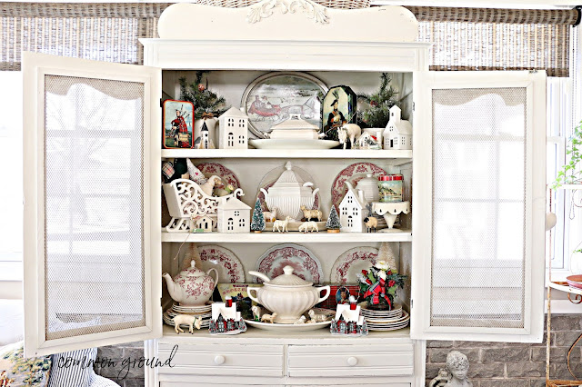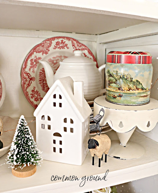 Another piece of antique furniture that I have that's especially fun to share different collections at Christmas is my old Pie Safe, which I've dubbed the Holiday Cupboard. It came by that name because it's a fun place to decorate with seasonal and holiday themes. This Christmas display from a few years ago featured some of my collection of vintage Tartan Scottish biscuit and candy tins. transferware, and white ceramic houses.