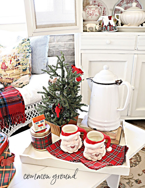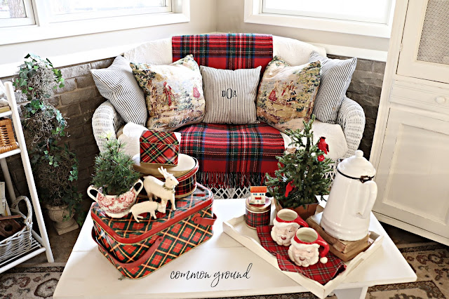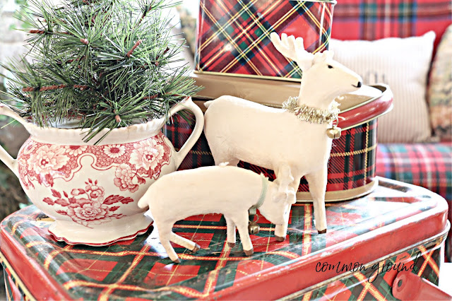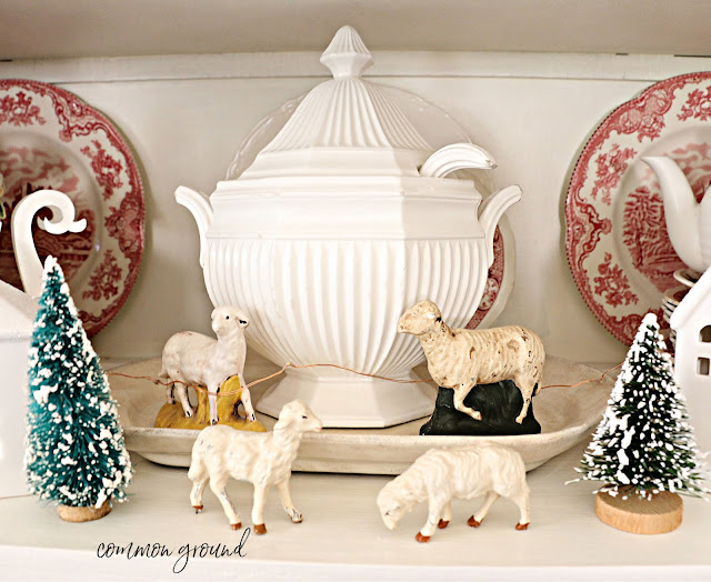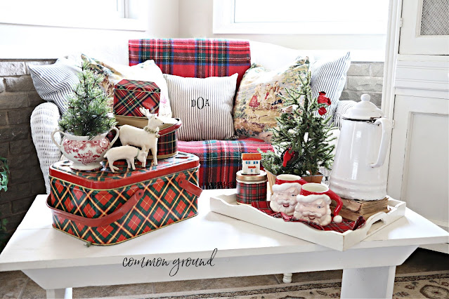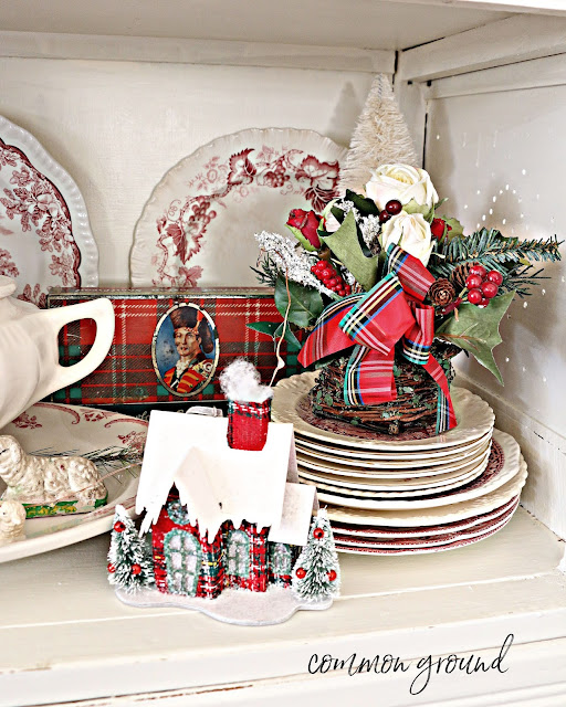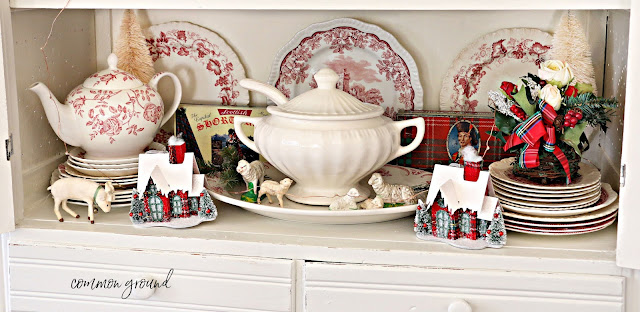 If you look closely you can see a few of my nativity sheep that are scattered around the tureens and red transferware. Of course anything Tartan Plaid has become a real obsession for Christmas. It lends itself to any and all Christmas collections.