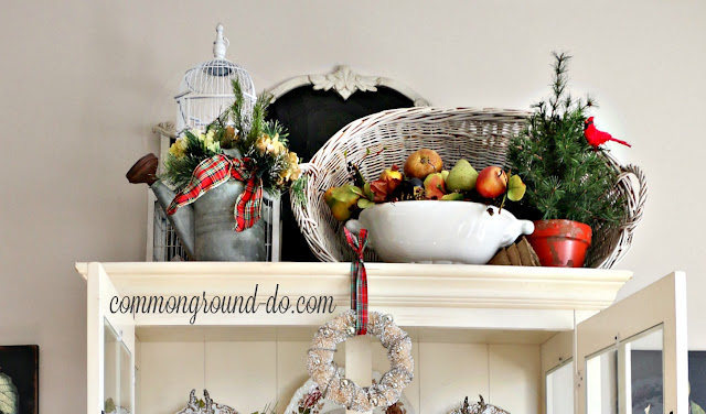 White ironstone tureens, platters, and pitchers are another collection that is perfect for Christmas display. I scatter them around the house for an instant Christmas display by just adding a bit of red plaid ribbon.