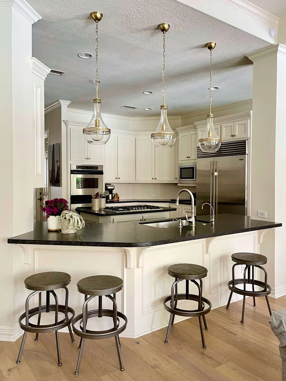 The heavy overhead cabinet above the kitchen sink was removed, it really closed in the kitchen and felt dated. The homeowner opted to cut down the bar too, so that there was a more open feel between the kitchen and family room.