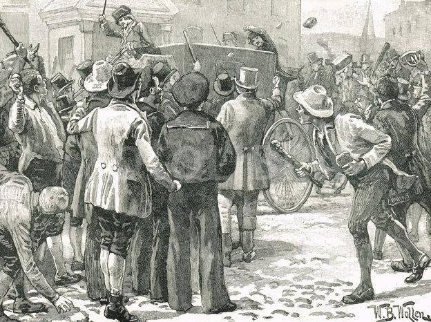 This attack was stopped by the timely arrival of Lieutenant-Colonel Thomas Brereton, with a single troop of dragoons. Despite Sir Charles’ demand that the troops open fire on the crowd, Brereton spoke to them instead and they dispersed peacefully. At about three o’clock Col. Brereton returned with his troopers to their barracks. He immediately requested reinforcements, but he might have been more cautious had he known that while transporting their prisoners to jail, the Bludgeon Men were waylaid and the arrested “troublemakers” were freed.