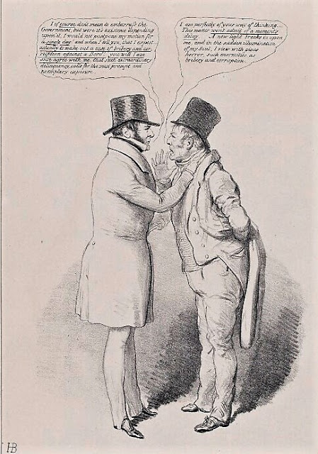 The man who invented the London Bobby's, Sir Robert Peel, watched his performance in the House of Commons and was not impressed. “This Wetherell unbuttoned his braces (suspenders) when he began to speak, and put his hands into the waistband of his breeches…Horace Twiss said he was very mad, and had but one brief lucid interval, which was between his breeches and his waistcoat.”