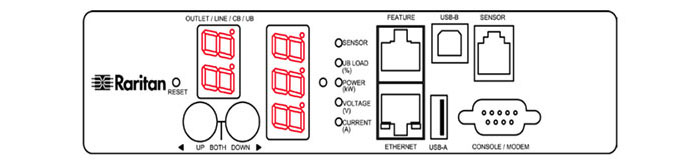 Next to these ports, there are some LED displays and an array of LED lights: a three-digit rectangular row (can show the active power, the current, the voltage or active power of the selected line, when the firmware upgrade is being performed or if the circuit breaker has been tripped), a two digit rectangular row (shows the currently selected outlet, the selected circuit breaker or the selected line, as well as the selected inlet active power) an Up and Down button and five LEDs for measurement units (this particular model can automatically detect the PDU orientation and adjust the alphanumeric digits). The LED lights show the status of the Current, the Voltage, the Power, the Unbalanced Load percentage and the sensor (which lights up only of it detects a connection with any environmental sensor).