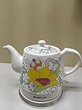 Features overall dims are 105 long x 6 wide x 78 tall Capacity 12 liter 55 cups 1000 watts Floral design ceramic kettle teapot 360 degree rotary base easy to use Concealed stainless steel heating element Boildry protection Automatically turns off when water boiled Water level marks light indicator ce gs cb rohs and fda approval No heavy metal shown on fda report Sku number 120391089 Shipping to canada and mexico import duty and fees apply Boils water yet has substantial ceramic teapot touch and feel Bottom plate that is not in contact with water is plastic